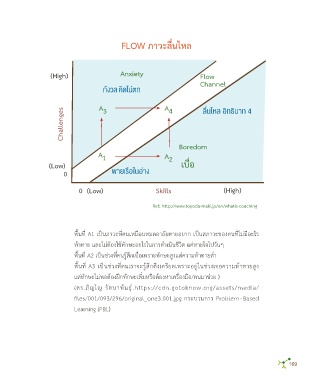 สิ่งนั้นได้ เป็นภำวะที่มนุษย์จะท�ำอะไรได้ผลมำก และมีควำมสุขมำกที่สุด ภำวะ FLOW พื้นที่ A2 เป็นช่วงที่คนรู้สึกเบื่อเพรำะทักษะสูงแต่ควำมท้ำทำยต�่ำ