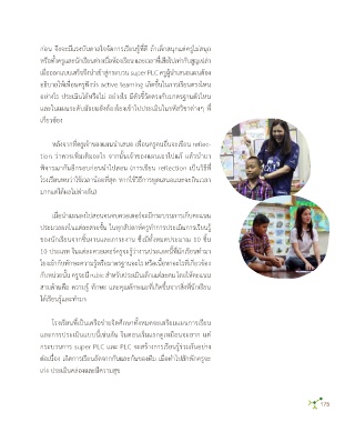 ของตนต่อไป ครูมีอิสระที่จะคิดในสิ่งที่อยำกท�ำ สนุกที่จะท�ำ ให้ทั้งครูและนักเรียนได้ กระบวนกำร super PLC และ PLC จะสร้ำงกำรเรียนรู้ร่วมกันอย่ำง