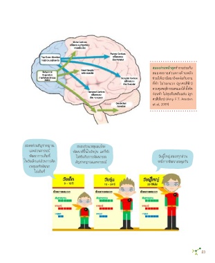 สุด กระบวนกำรสร้ำงเยื่อ Myelin จะเริ่มเกิดตั้งแต่ช่วงวัยเด็กเล็ก แต่จะด�ำเนินไป พัฒนาการเต็มที่ ไม่ทันกับการพัฒนาของ วัยผู้ใหญ่สมองทุกส่วน