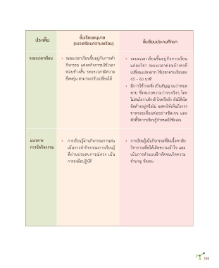 ประเด็น ชั้นเรียนอนุบาล ชั้นเรียนประถมศึกษา ระยะเวลาเรียน • ระยะเวลาเรียนขึ้นอยู่กับการท�า • ระยะเวลาเรียนขึ้นอยู่กับคาบเรียน